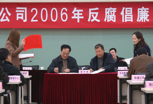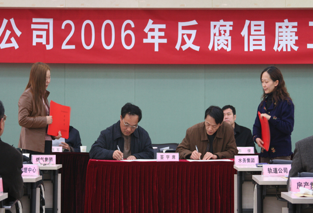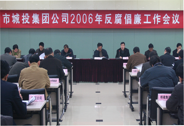 2月14日,公司在4樓大會議室召開了2006年反腐倡廉工作會議。此次會議是為了認真學習貫徹中央和省市反腐倡廉工作會議精神、總結城投集團公司2005年黨風廉政建設、反腐敗工作和研究部署2006年反腐倡廉工作召開的。會議進行了三項議程:一是黨委副書記、紀委書記吳志軍同志作題為《全面履行職責,加大防治力度,深入推進黨風廉政建設和反腐敗工作》的工作報告;二是黨委書記、董事長吳長均同志與所屬各單位黨風廉政建設第一責任人簽訂黨風廉政建設責任書;三是吳長均同志就如何深入推進城投集團公司黨風廉政建設作重要講話。