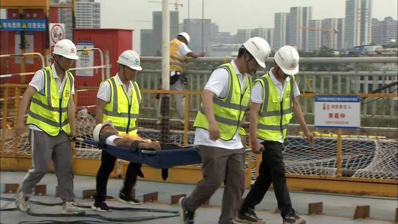 科目二:長豐橋正常施工時橋面突發(fā)火情,現(xiàn)場管理人員立即組織滅火,同時撤離施工人員。鋼橫梁涂裝工人撤離過程中不慎失足落水、主拱圈腳手架上施工人員在撤離過程中腿部受傷,喪失自主逃生能力,救援隊協(xié)助開展救援行動。
