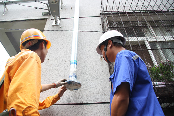 徐清公寓就是典型的老舊社區(qū),今年夏天的時(shí)候老姜和老李多次前來“踩點(diǎn)”,因?yàn)闆]有小區(qū)的平面圖和地下管網(wǎng)圖,他們專門為小區(qū)丈量測(cè)繪。武漢進(jìn)入三伏天的時(shí)候,老姜他們頂著烈日正式入場,打支架、裝立管。由于徐清公寓自身沒有氣源,須借路挖至銷品茂尋氣源,這無疑又增加了施工難度。