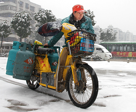 清晨6時(shí),武煤百江公司送氣工鮑學(xué)武匆忙告別麻城的親人,奔向武漢。1月30日晚上,回鄉(xiāng)的他看到天氣預(yù)報(bào)武漢將有小到中雪,即決定返漢。一到店,他就推著車送氣了,不歇?dú)獾厮土?9瓶,一直忙到下午2時(shí)才吃上飯。據(jù)統(tǒng)計(jì),31日,武煤百江公司送氣工除三人生病外,全部在崗送氣,公司共銷售液化氣1萬多瓶,送氣上門率達(dá)95%以上。