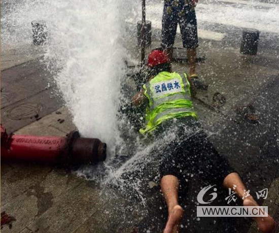 8月3日正午12:35,武昌供水部武昌管線所接熱線信息稱,尚隆地球村小區(qū)門前消火栓被車輛撞斷。當(dāng)搶修人員徐金奎迅速到現(xiàn)場(chǎng)時(shí),被撞斷的消火栓已脫離地面,水柱噴射高達(dá)3米,形成球面沖頂。