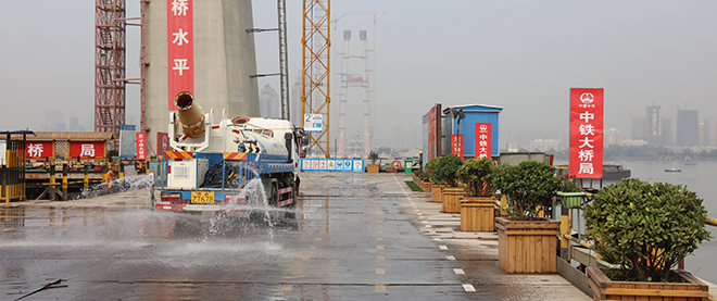 工程代建單位道橋公司有關(guān)負(fù)責(zé)人介紹:“我們這個(gè)工地的特點(diǎn)就是綠色環(huán)保,對(duì)揚(yáng)塵嚴(yán)格控制,通過(guò)營(yíng)造景觀、種植樹木提高工地的‘顏值’,讓工地變成花園。”在武昌岸的施工現(xiàn)場(chǎng),花草樹木都被搬上了臨時(shí)搭建的鋼棧橋。為了提高花草樹木成活率,特別選用了成活率高的黃楊球、鐵樹等,并按照季節(jié)更換花草,還安裝了自動(dòng)灌溉系統(tǒng)。