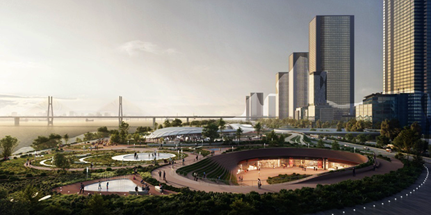 月亮灣城市陽臺項目,位于武漢市長江二橋以南、武昌濱江商務(wù)區(qū)核心節(jié)點區(qū)域,規(guī)劃用地約194畝,涉長江岸線約1.1公里。該項目是全市規(guī)劃建設(shè)的九大陽臺之一,也是唯一擁有天然地域優(yōu)勢的城市開放空間。項目由全球著名設(shè)計公司英國扎哈?哈迪德建筑師事務(wù)所設(shè)計,分一期和二期建設(shè)。一期為景觀綠化及陽臺工程,2019年1月開工建設(shè)。二期整體策劃定位為武漢長江生態(tài)文化長廊綜合展示中心。