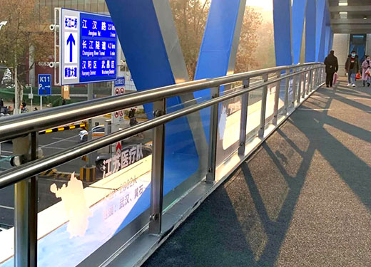 同濟人行天橋主橋橫跨交通繁忙的解放大道,北接同濟醫院門診主樓,南連同濟醫院生殖中心。天橋主梁(一跨)全長53米,天橋兩端共設計4個出入口,兩側安裝有上下行扶梯,并設置了1:2梯道,方便行人通行。
