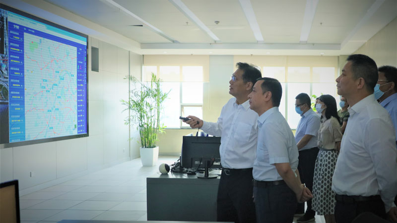 陳勁超一行首先查看了市城投集團公司城市運營管理信息化集成平臺運行情況。李兵介紹了城投智慧水務調度、天然氣管網和過江橋梁監控、智慧停車等信息化管理工作流程,以及城市污水處理工作情況。
